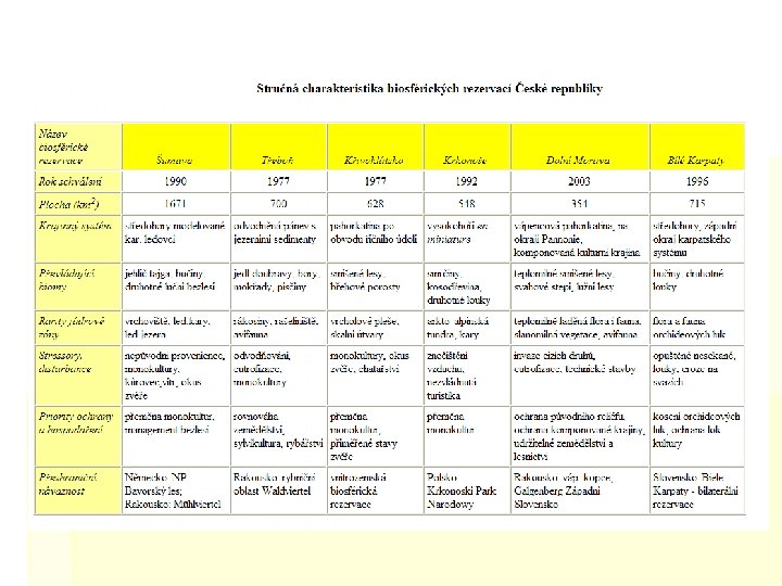 Biosférické rezervace UNESCO § vyhlašovány OSN pro vzdělání a vědu v rámci programu Člověk a biosféra (MAB – Man and the Biosphere) § 1974 - základní směrnice týkající se biosférických rezervací § ochrana genofondu, vědecký výzkum sledující využívání a zneužívání přírodních zdrojů, výměna informací v mezinárodním měřítku a výchova odborníků i veřejnosti pro cíle ochrany přírody § světová síť BR - zahrnuje všechny základní biomy Země + postižení různorodosti jejich zatížení § jako biosférické rezervace mohou být vyhlášena pouze území chráněná národní legislativou (zákonem)
