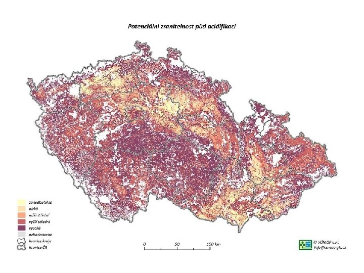 Okyselování půdy • Příčina acidifikace – znečištěné ovzduší • Negativní působení zvýšené acidifikace spočívá ve vymývání látek z půdního profilu při kterém dochází k migraci živin i uvolňování prvků rizikových pro půdní organismy – v CR není zásadní problém. • Důsledkem acidifikace je především zhoršení kvality půdy a snížení její odolnosti k zhutnění a erozi, zvýšené nebezpečí rozvoje chorob rostlin nebo snížení úrodnosti.