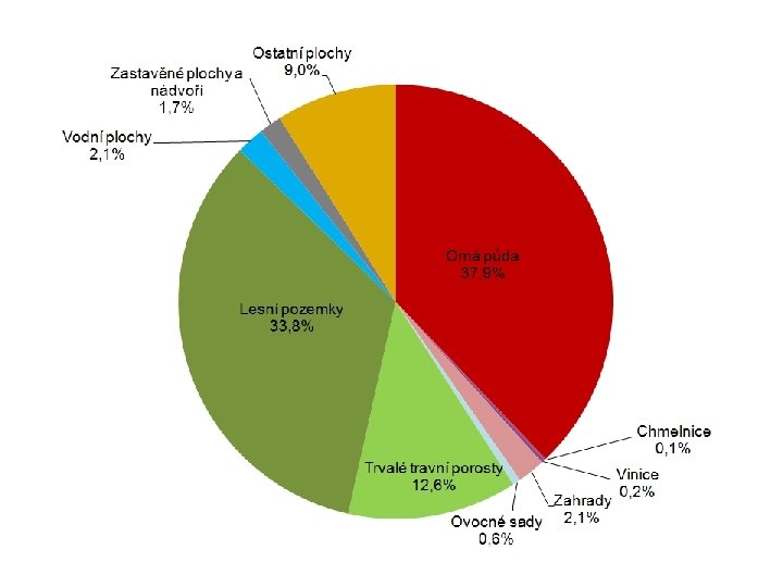 Zemědělská půda v ČR • v ČR přibližně 4, 25 mil. ha zemědělské půdy → z toho cca 3 mil. ha půdy orné • na 1 obyvatele ČR → cca 0, 3 ha orné půdy • celosvětový průměr → 0, 22 ha (v roce 1961 to byl skoro dvojnásobek…) v Číně je to měně než 0, 1 ha (za posledních 20 let ztratila 15 milionů ha orné půdy) • • v ČR se denně zastaví = ztratí více než 10 ha orné půdy, obvykle nejvyšší bonity… Narůstá plocha trvalých travních porostů, zejména na úkor orné půdy. Mírně stoupá plocha lesů, které mají důležitou funkci pro retenci vody v krajině i pro zachování biodiverzity - • Celková výměra zemědělského půdního fondu ČR klesá, v období 2000– 2014 se jednalo o pokles o 64, 3 tis. ha, což je téměř 1 % území ČR. Významným faktorem záborů zemědělské půdy je rozšiřování zastavěných a ostatních ploch, které v roce 2014 tvořily 10, 7 % území ČR. -