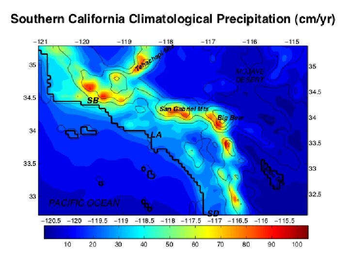 Southern California Climatological Precipitation (cm/yr) pr ap CKE DF LOW e at im ox BLO n tio c re di of w flo du g rin in ra t en ev s Precipitation is enhanced in the coastal zone because of blocked flows that develop parallel to the coast as low-level air masses are forced toward the interior. Once this blocked flow is in place, the moisture-laden onshore flow must surmount it in addition to the topography, enhancing precipitation well away from the coastal ranges. This is another example of how local dynamics profoundly affect the geographical distribution of a quantity relevant to climate.