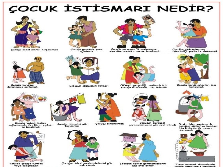Duygusal İstismar Gelişim düzeyinin üstünde sorumluluklar yükleme (annelik görevi gibi) Çocuğun var olan potansiyelinin üzerinde belkenti içerisinde olma (Doktor. . avukat) Kardeşler arasında ayrım yapma, değer vermeme,