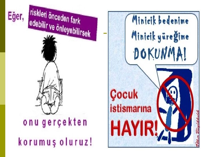 Cinsel İstismarın Çocuklarda Bıraktığı Etkiler(Davranışsal) Aşırı temizlenme durumu ya da tam tersi p Evden kaçmak p İnsanlardan ve bazı yerlerden korkmak ve kaçmak p Okul ve disiplin problemler, suça yönelme p Madde bağımlılığı, kendine zarar, intihar girişimleri p Kendi yaşının üzerinde cinsel bilgiyi ifade etmek, arkadaşlarıyla ve oyuncaklarıyla cinsel içerikli oyunlar oynamak p