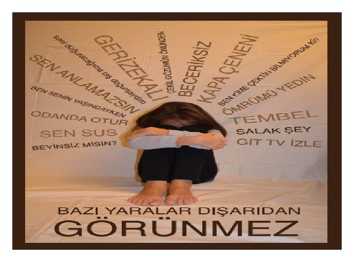Cinsel İstismara Maruz Kalan Çocuklarda Görülen Belirtiler 13 -18 Yaş • Davranışsal-fiziksel belirtiler: Korkularının günlük yaşantısını engelleyecek boyuta gelmesi, bağımlılık yapan maddelere düşkünlük, evden- okuldan kaçma, başkalarını istismar etme, takıntılı düşünce ve davranışlar, duygusal ve fiziksel yakınlıktan kaçınma, yeme bozukluğu , sinirlilik, riskli cinsel davranışlar, süreğen enfeksiyonlar, sosyal içe kapanma, intihar. • Duygusal belirtiler: Öfke, korku, suçluluk, utanma, güvensizlik, çaresizlik, depresyon, intihar düşüncesi, kirlenme duygusu