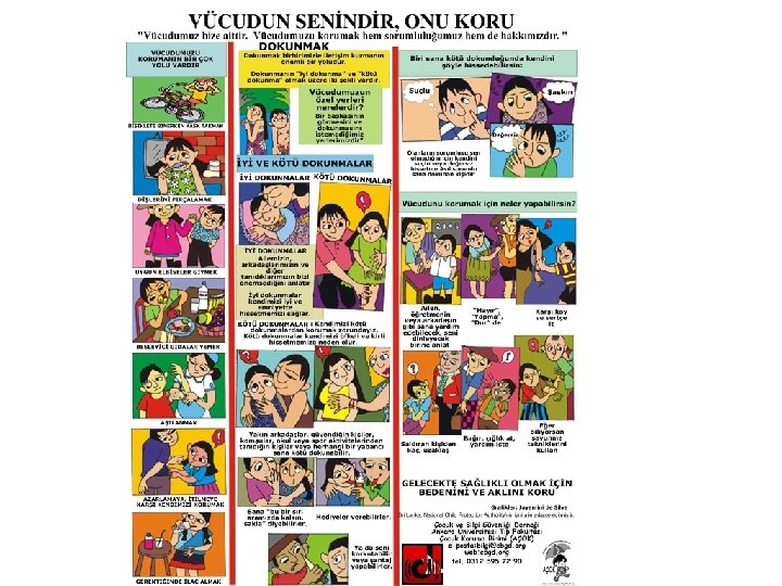 • • • • Eğer; - Çocuk istismarı belirtileri, - Adli bildirim zorunluluğu -Türkiye’de çocuk istismarına ilişkin yasalar, - Çocuk istismarı mağdurları, - Aileye verilecek destek, - Çocuk istismarı veya ihmali ile ilgili diğer, Sorularınız veya bildirimde bulunacaksanız, lütfen aşağıda belirtilen kurumlarla iletişime geçiniz. ! Okulun Rehberlik Servisine Rehberlik ve Araştırma Merkezine Sosyal Hizmetler ve Çocuk Esirgeme Kurumu İl Müdürlükleri Baroların Çocuk Hakları Merkezleri Emniyet Müdürlüğü Çocuk Polisi Şubeleri Hastaneler bünyesindeki Çocuk Koruma Merkezi/Birimleri