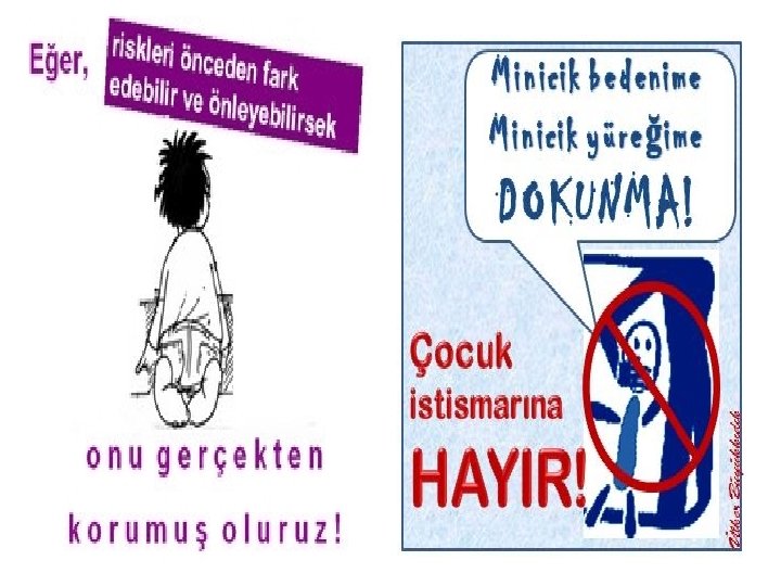 Bizler çocuklarımıza; • • İyi dokunma ile kötü dokunmayı ayırtetmeyi İstemediği bir durumda “HAYIR” diyebilmeyi Kişisel alanlarını bilmeyi ve korumayı Sorunlarla baş edebilmeyi Haklarını bilip savunabilmeyi Kendini ifade etmeyi Kendine ilişkin olumlu ve güçlü yanlarını fark etmeyi • Kendini güvende hissetmediğinde yardım alması gerektiğini öğretmeliyiz.