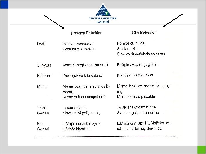 SGA BEBEKLER • Boy ve baş çevreleri normaldir • Vücut ağırlıkları daha düşüktür • İntrauterin gelişme geriliği vardır (plasental anomaliler, maternal toksemi, enfeksiyon, kalıtım, çevresel faktörler, malnütrisyon) • Çevre ısı değişikliklerinden fazla etkilenirler Hipoglisemi riski (yetersiz depo) ve mekonyum aspirasyon riski yüksektir. .
