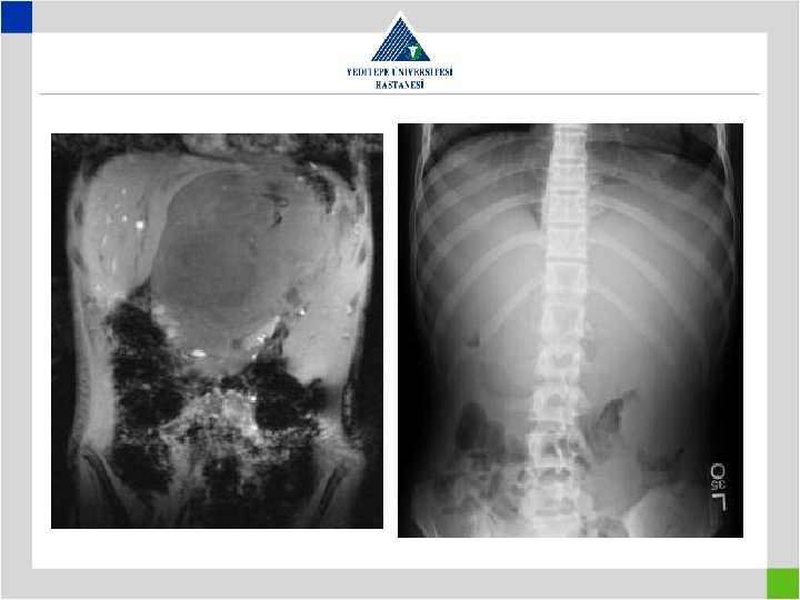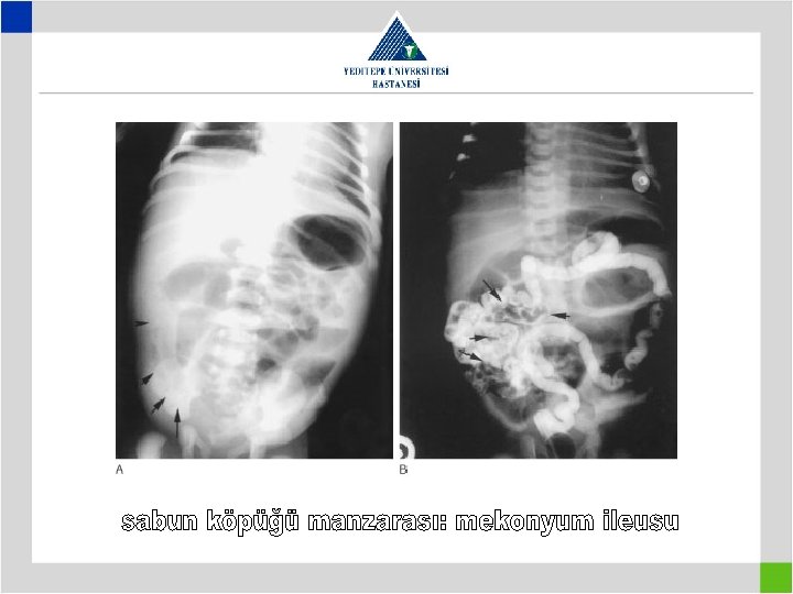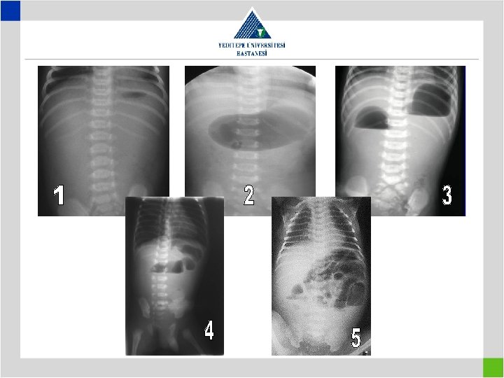 • • • 2 Günlük erkek hasta Safralı kusma Mekonyum çıkaramama Abdominal distansiyon Rebaund yok, Defans yok ADBG: Genişlemiş gazla dolu hava-sıvı seviyesi, kolonda gaz görülmüyor