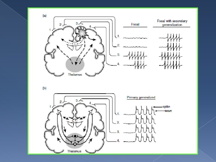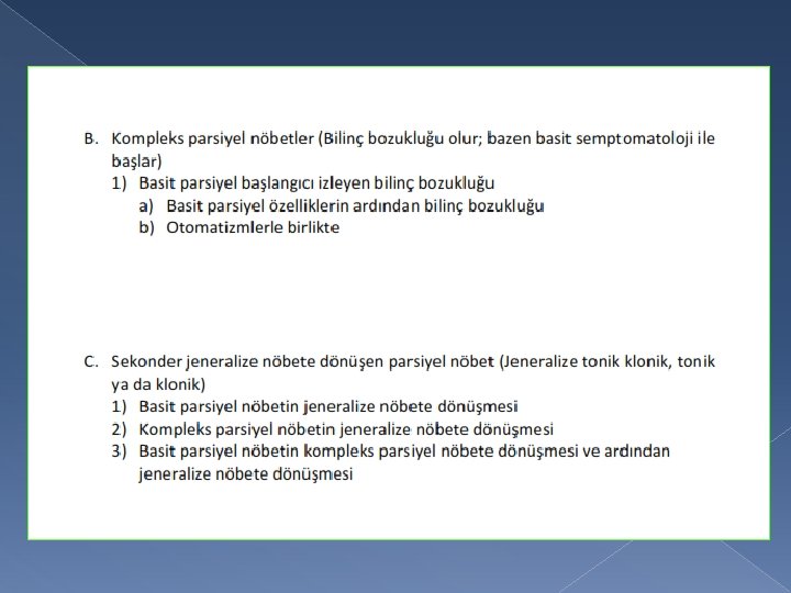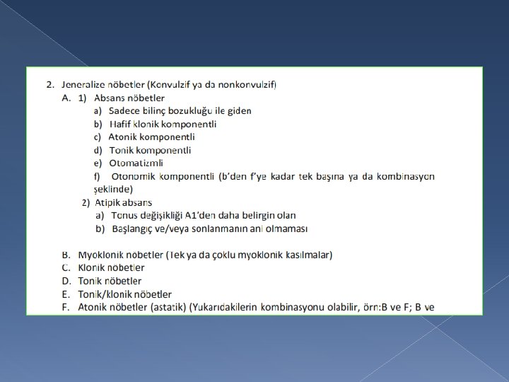 Başlangıç � Jeneralize konvulsiyon: Anormal deşarjlar her iki hemisiferde aynı anda ortaya çıkar. � Parsiyel konvulsiyon: Deşarjlar bir hemisiferde başlar ve nöbet süresince başladıkları hemisiferde sınırlı kalır. � Sekonder jeneralizasyon gösteren konvülsiyonlar: Deşarjlar bir hemisiferde başlar ve diğer hemisifere yayılım gösterir.