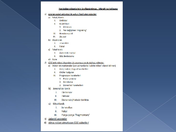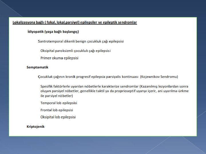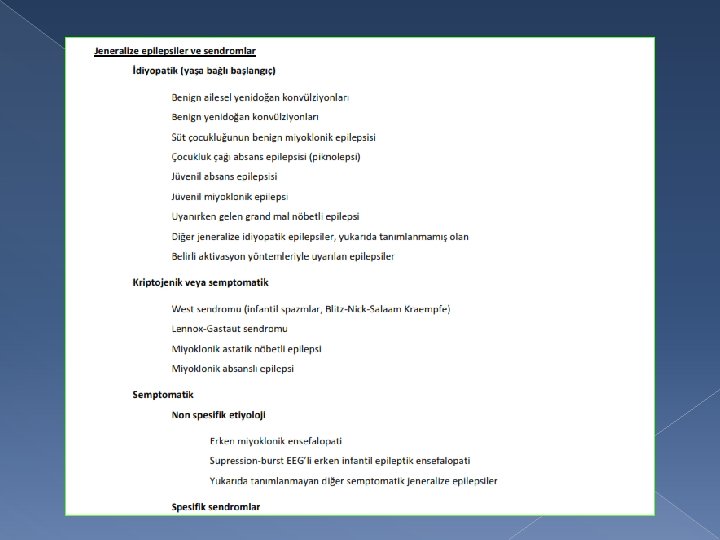 � 1989: topografi ve etiyoloji � Topografi: jeneralize veya lokalizasyon ile ilişkili � Etiyoloji: semptomatik, idiyopatik, kriptojenik