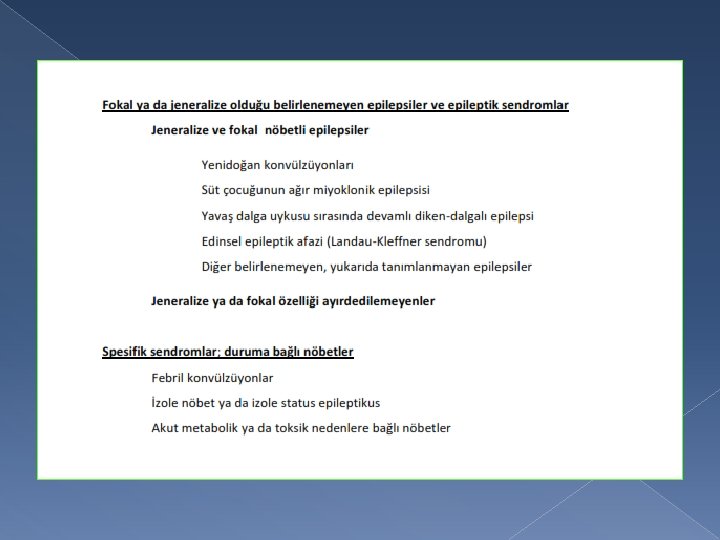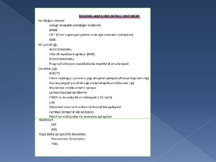 Epileptik sendrom � Belirti ve bulgularıyla özgün bir epileptik durum � Ortaya çıkış yaşı � Nöbet tipi � EEG bulguları � Eşlik eden klinik özellikler