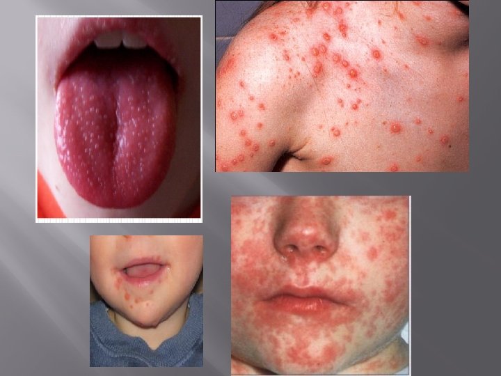 KIZIL Ø Tonsiller ödemli, üzerinde eksuda, palatal peteşiler görülebilir. Ø ilk 2 gün hiperkeratotik membran nedeniyle beyaz çilek dili olur, 4 -5. günler membran kalkar, parlak kırmızı mukoza kalır, kırmızı çilek dili görülür. Döküntüler; Ø Koltuk altı ve kasıklardan, tüm vücuda yayılan, • Basmakla sarımsı renkte solan (negatif dermografizm), • Eritrodermi zemininde zımpara kağıdı şeklinde noktasal kırmızı papüller. • El ve ayakta daha belirgin olan yaygın deskuamasyon ile iyileşir. • Ø Ø Ø Kıvrım yerlerindeki peteşiyal döküntüler (Pastia çizgileri) Soyulmuş tavuk derisi görüntüsünde Yüzde ve alında kızarıklık, ağız çevresinde solukluk