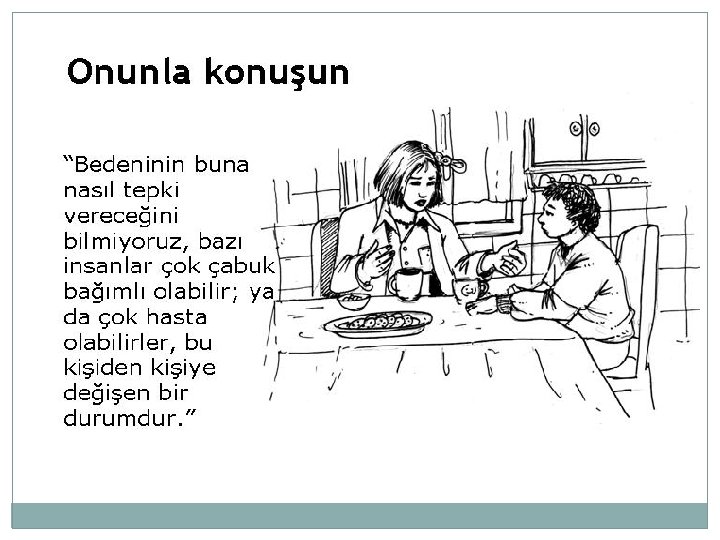 ÖNLEME: ERGENLİK DÖNEMİ �Ergenlik dönemi özelliklerini iyi tanıyın, madde bağımlılığı için dönemin riskli olduğunu ancak her ergenin madde kullanmayacağını bilin. �Çocuğunuzun arkadaşlarını ve ebeveynlerini tanıyın, onları evinizde ağırlayın, arkadaşlıklar kurun. Aileleri ile onların çocuklarından bekledikleri davranışlar üstüne konuşun. �Çocuğunuzun bulunduğu yer konusunda bilgi sahibi olun. Eğer çocuğunuz ‘bir arkadaşının evinde’ ise bu arkadaşı ve ailesini tanıdığınızdan emin olun. Eğer sinemaya gittiyse hangi sinemaya gittiğini bilin. �Kurallarınızda tutarlı olun.