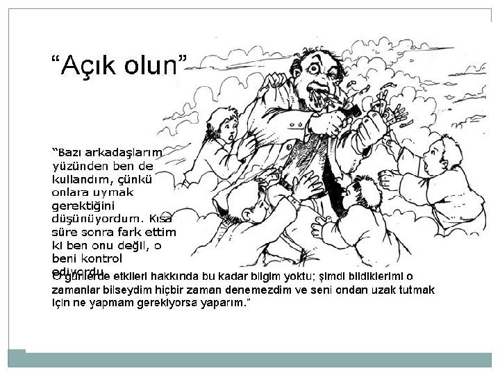 MADDE KULLANAN ÇOCUĞU FARKETME YOLLARI (2) � Giysilerde ve nefeste maddenin kokusu. . � El, yüz ve giysilerde boya ve lekeler. . � Duman veya kimyasal kokuları saklamak için tütsü, oda deodorantı veya parfüm kullanımı. . � Alkol, sigara kokusunu gizlemek için yeni gargara veya naneli şeker kullanımı. . � Pipo ve sarma kağıt gibi madde teçhizatına dair kanıtlar. . � Saç spreyi, oje, tipeks (daksil), kağıt torba ve bezler gibi solunacak ürün kanıtları. � Genişlemiş göz bebekleri veya kanlı gözleri gizlemek için göz damlası şişeleri. . � Kendisine olan özeninin azalması. . � Sık sık veya uygunsuz zamanlarda güneş gözlükleri takmak, uzun kollu giysiler giymek,