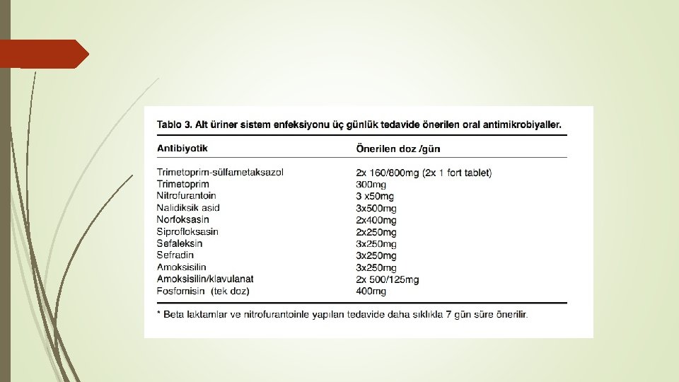 Akılcı Kullanım İdrar yolu enfeksiyonlarında en çok kullanılan ilaçlar TM-SMZ ile kinolonlardır. Üçüncü kuşak sefalosporinlerden seftriakson, sefotaksim, ayrıca aminoglikozidlerden gentamisin parenteral yolla, sefiksim de oral yolla tedavide önerilir. Ancak betalaktamların dışkı ve vajinal floraya da yan etkileri olması kullanımlarını sınırlayabilir. Tedavi verilirken antimikrobiyallere ülke, bölge direncinin bilinmesi önemlidir. Ülkemizde 1999 yılında yapılan çok merkezli çalışmada E. coli suşlarında direnç TM-SMZ’a %22 oranında, siprofloksasine %7 oranlarında belirlenmiştir. Diğer çalışmalarda TM-SMZ direncini %40 -50 oranlarında bulan çalışmalar da vardır.