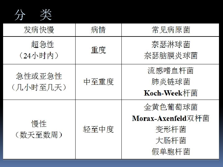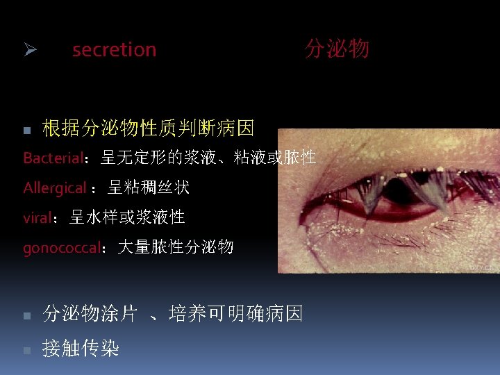 Acute or subacute conjunctivitis v Pathogenic bacteria v streptococcus pneumoniae, Koch-weeks bacillus, hemophilies influenzae, staphylococci, etc。流感嗜血杆菌, Koch-Week杆 菌, 肺炎链球菌 v characteristic often occurs in epidemic form and is called “pinkeye”; acute onset; both eyes invasion or separated by 1 -3 days; symptoms: tearing, foreign body sensation, burning sensation