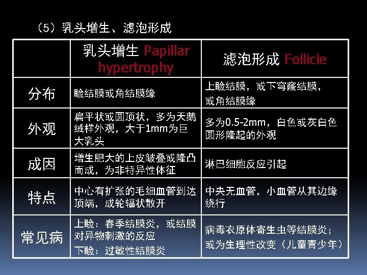 Chronic Hyperemia mildly and little mucous secretion Symptoms: Itching, foreign body sensation, eyestrain (眼疲劳). Signs: hyperemia, little papillary hypertrophy and follicle