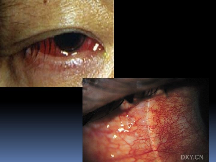 v. Clinical symptoms and signs symptoms: pain, photophobia, tearing signs: n eyelids edema , n conjunctival hyperemia n chemosis conjunctiva can protrude out of lid fissure when chemosis strongly