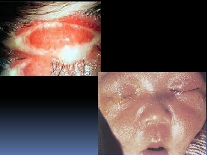 Signs: l Secretion is copious , so the lids are often firmly stuck together on waking l Hyperemia: especially in fornix and bulbar conjunctiva l Pseudomembrane or membrane