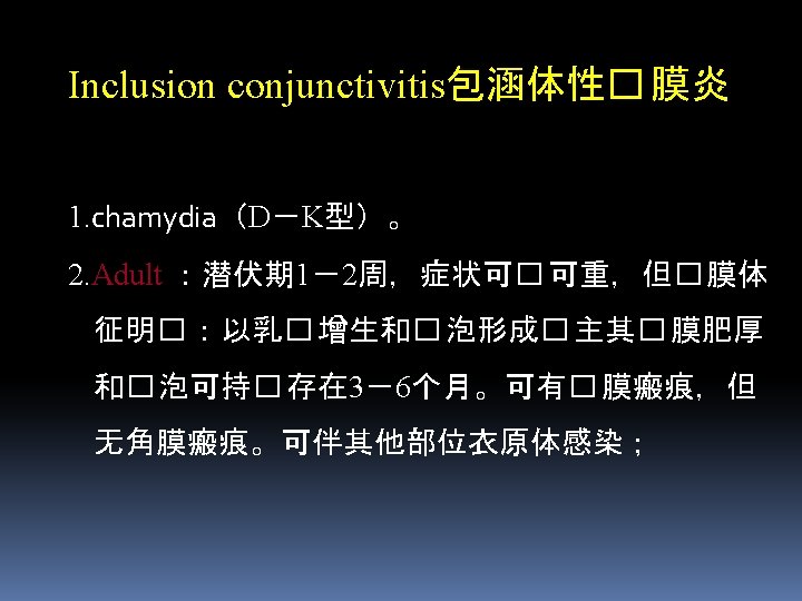 Trachoma A chronic infective keratoconjunctivitis Epidemic before the 1950 s in our country, and it is the first cause of blindness Drop obviously after the 1970 s and only appear in remote area now. l Etiological factor – chamydia (antigenic type A、B、C、or Ba)