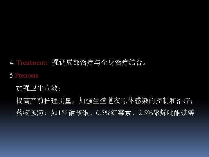 Treatment Systemic therapy is as important as topical therapy Topical therapy: n conjunctival sac flushing frequently with saline or 1: 10000 liquor potassic permanganate (高锰酸钾)or 3%boric acid when conjunctival secretion is profuse. n Eyedrops and eye-ointment:proper antibiotic application can shorten course of disease, eyedrops application frequently