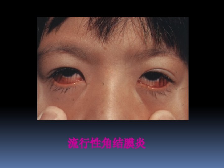 Epidemic hemorrhagic conjunctivitis Caused by enterovirus type 70, self-limited Strong infective, epidemic widely in 1971 in our country Clinical manifestion symptoms: pain, photophobia, tearing, red, foreign body sensation Signs: hyperemia, chemosis, copious follicles, subconjunctival hemorrhage(onset from the upper conjunctiva), preauricular lymphadenopathy Treatment: same to epidemic keratoconjunctivitis
