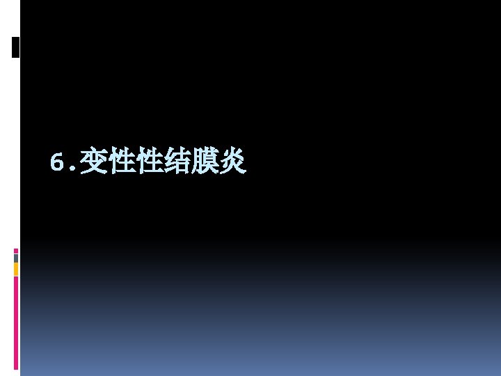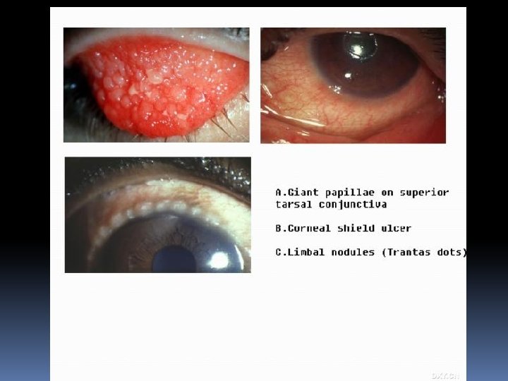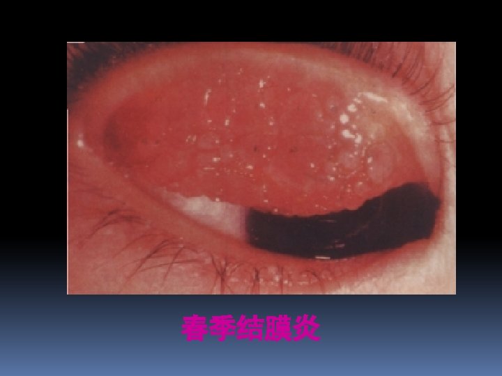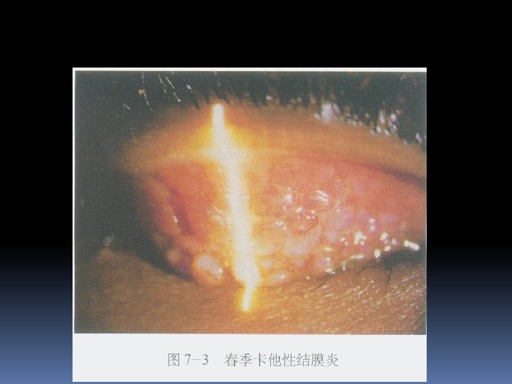 Vernal conjunctivitis v it’s a bilateral allergic disease that usually begins in the prepubertal years (青春期)and lasts for 5 -10 y, more oftener in boys than in girls. seasonal, repeated v Clinical manifestion v symptom: extreme itching v Signs: deviding into 3 types according to diseased region as following: