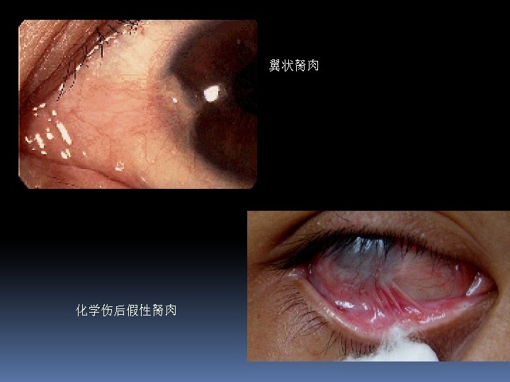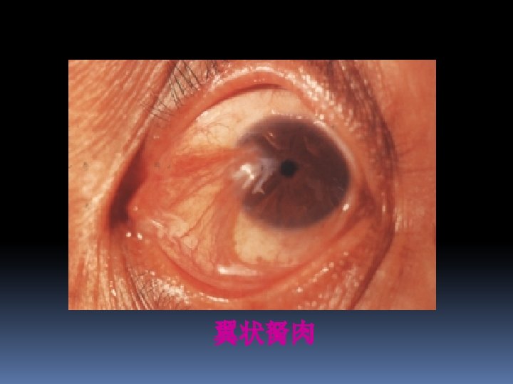 Pterygium( 翼状胬肉) v Cause is not clear, it is thought to be an irritative phenomenon due to ultraviolet light, drying and windy environments. v Signs: fleshy, triangular encroachment of a pinguecula onto the cornea, ususlly on the nasal side bilaterally. v Treatment:removed surgically when encroach to pupil area or cause clear astigmatism(散光)
