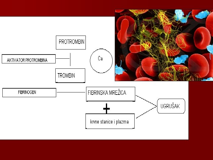 n n n U suštini koagulacija krvi je složen proces u kojem sudjeluje veliki br. faktora koagulacije. U osnovi proces se svodi na pretvaranje neaktivne forme enzima protrombina, u aktivnu formu, trombin katalizira prelazak u plazmi rastvorenog proteina fibrinogena u nerastvorljivi končasti fibrin. Niti fibrina tvore mrežu u koju se zapliću krvne stanice. Tako nastaje koagulum – ugrušak.