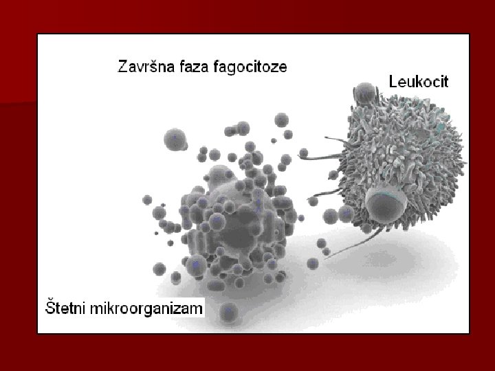 Antigen - antitijelo n n sve strane materije koje dospiju u organizam i pokrenu imunološku reakciju nazivaju se antigeni. Odbrambena funkcija leukocita bazira se na sposobnosti fagocitoze. Moć fagocitoze imaju neutrofilni granulociti i monociti koji unutarstanično razlažu antigene. Tako se neutralizira svaki antigen pa se zato ovaj vid imunološke reakcije naziva nespecifična imunološka reakcija.