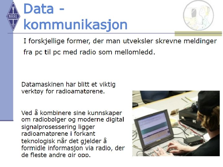 LA 1 A ü Den første lisensierte norske radioamatør var telegrafbestyrer Johs. Diesen som den 26. mars 1925 fikk en midlertidig lisens. ü Diesen sendte fra Moen i Målselv og var tildelt kallesignalet LA 1 A. ü Dette kallesignalet har senere vært reservert for kongefamilien. ü Telegrafstyrets vilkår for utstedelse av radiosendetillatelser, som kom i mars 1926, ga grunnlag for ordinære utstedelser av norske sendetillatelser. ü De norske radioamatørene var også med på å legge grunnlag for kringkastningen i Norge.