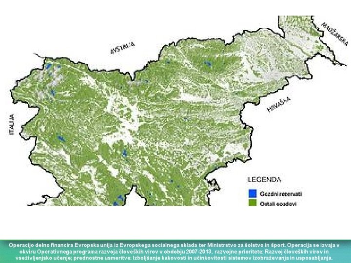 Osnovni podatki o slovenskih gozdovih • • • Površina gozda: 1, 185 mio. ha Lesna zaloga: 327 mio. m 3 (list. 175 m 3 /igl. 152 m 3) Prirastek: 7, 98 mio. m 3/leto Dovoljeni posek: 5, 1 mio. m 3/leto Dejanski posek (2009): 3, 3 mio. m 3 • Površina gozda / prebivalca: 0, 6 ha • Lesna zaloga / prebivalca : 161 m 3 • Prirastek (letni) / prebivalca: 4, 0 m 3