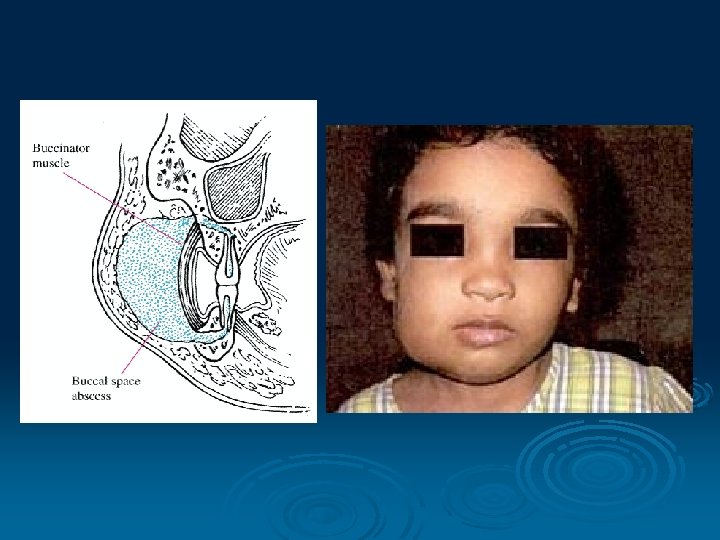 Vestibular Abscess § abscess perforate bone on the vestibular plate of the alveolar process § the roots of all teeth of upper and lower jaw § if the roots are localized upon the muscle insertion (lower jaw) or below muscle insertion (upper jaw)