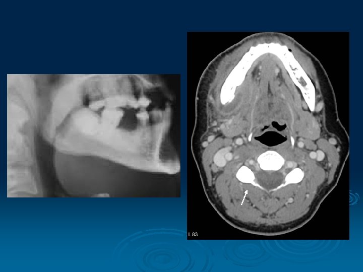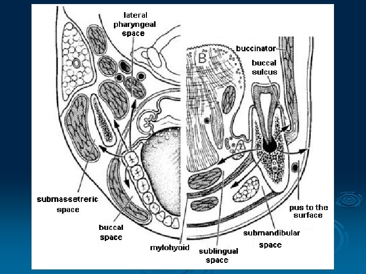 Submandibular Space § mandibular posterior teeth § the root of teeth lay root apices lay below the buccinator muscle insertion § spread beneath the mylohyoid muscle into the submandibular area
