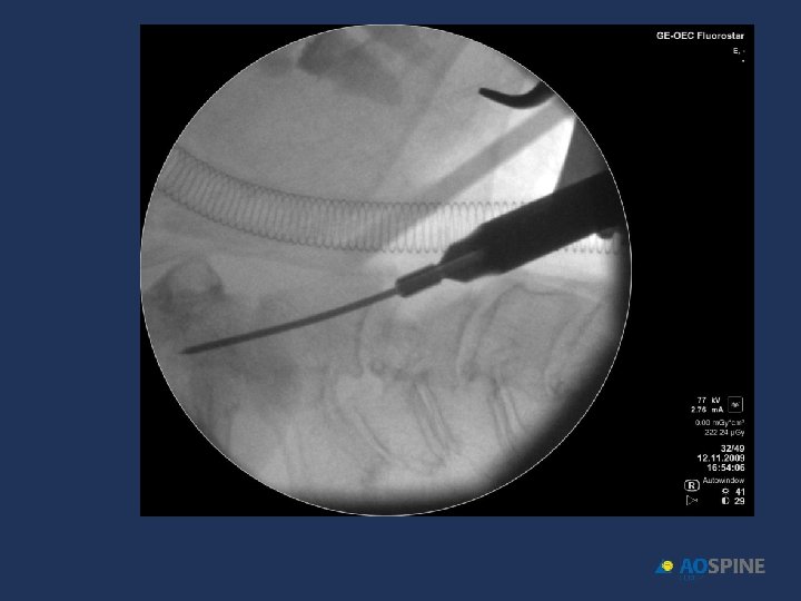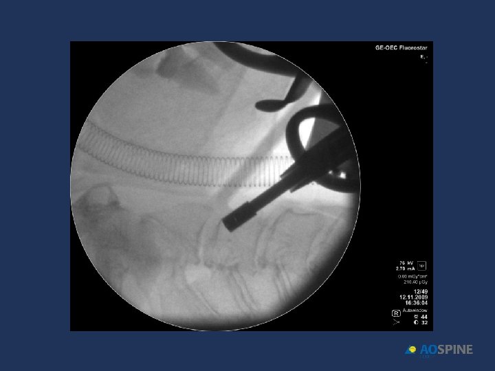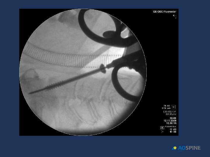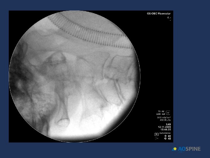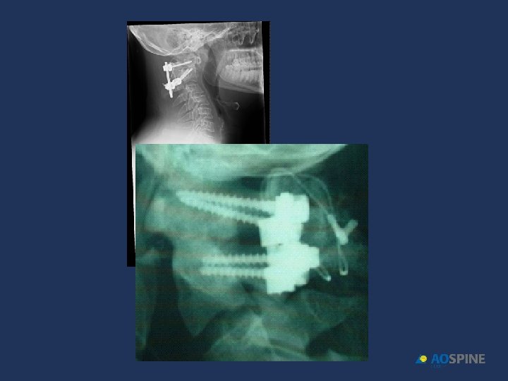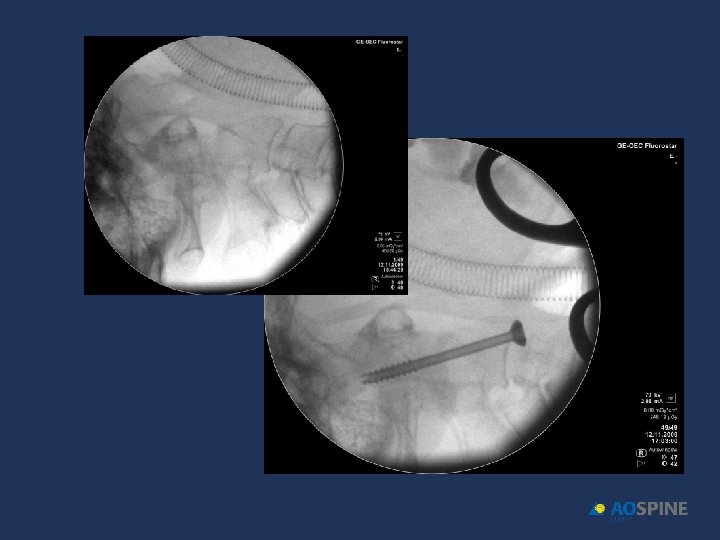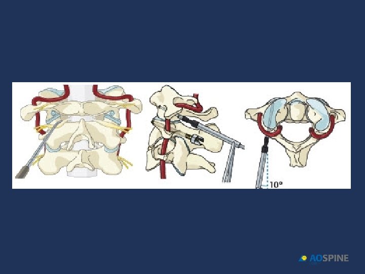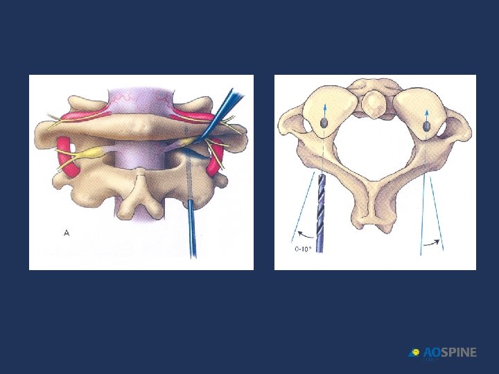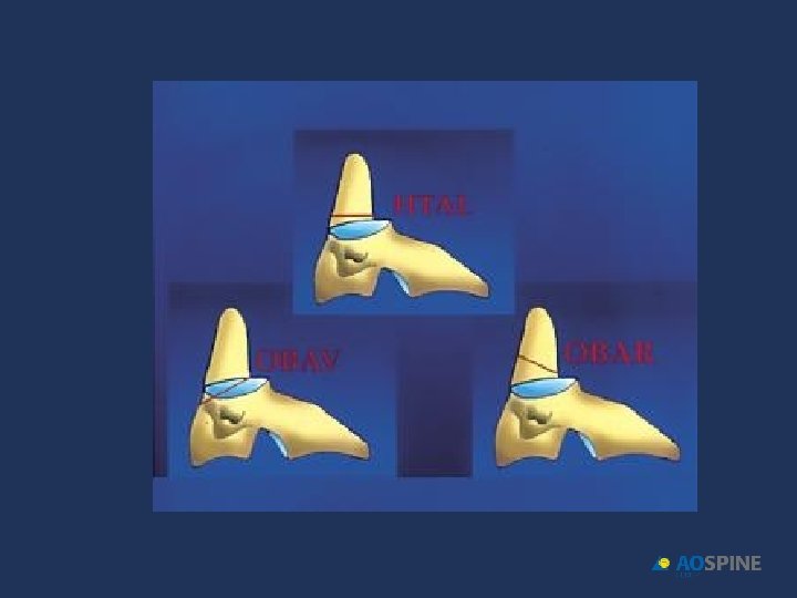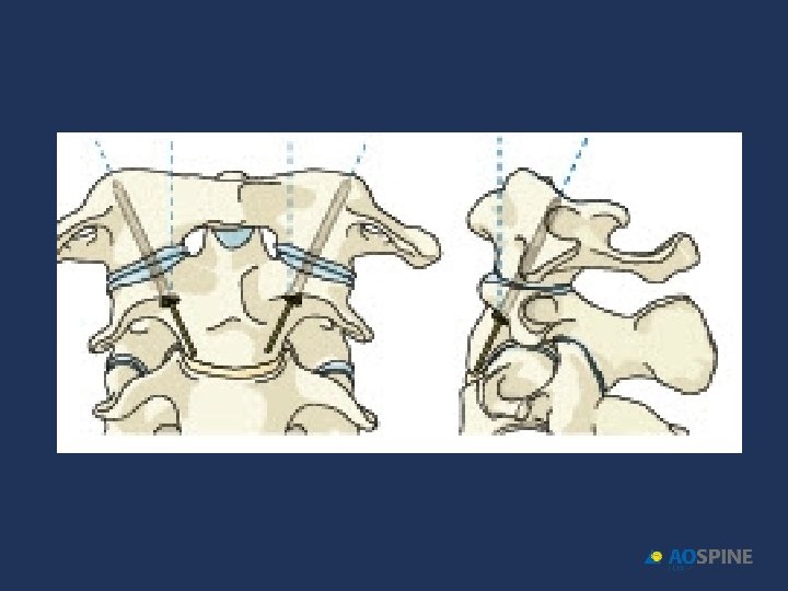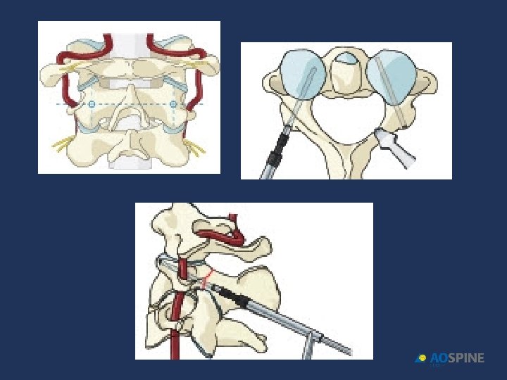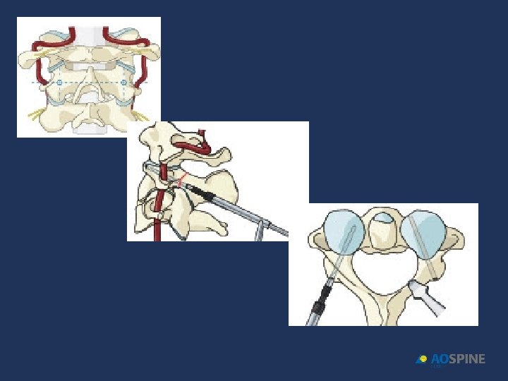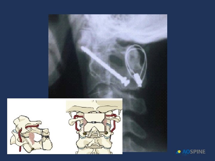 ODONTOID FRACTURES transarticular screws Anterior, Lateral, POSTERIOR (Magerl) 90 -99 % FUSION VERTEBRAL ARTERY LESION RISK 3. 7 - 8. 2% CONTRAINDICATIONS • ANATOMICAL VARIATIONSSCREW TRAYECTORY • GREAT HIGH THORACIC KYPHOSIS • SEVERE OSTEOPOROSIS NEEDS PREOP CT C 0 -C 3 (20% VA ANATOMICAL VARIATIONS))