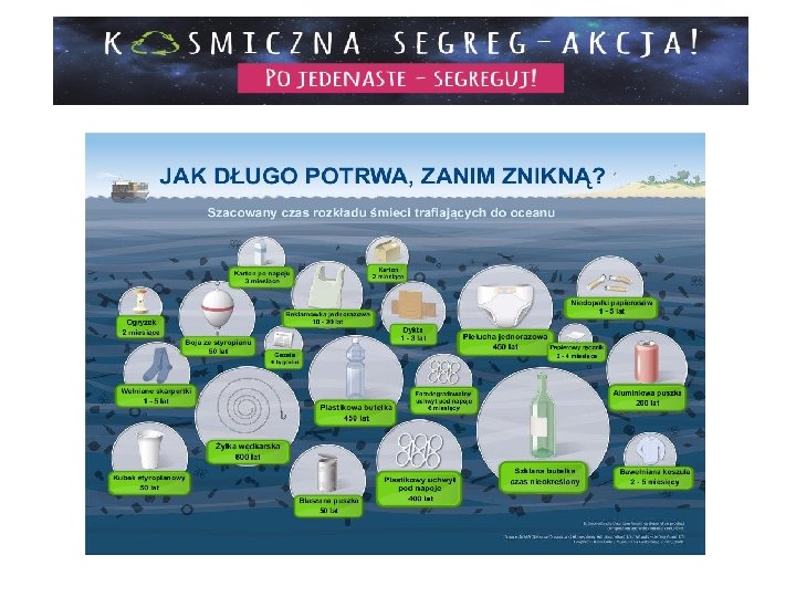 CZAS ROZKŁADU ODPADÓW BUTELKA PET ROZKŁADA SIĘ 100 DO 1000 LAT TOREBKA FOLIOWA 100 DO 400 LAT ü GUMA DO ŻUCIA 5 LAT PAPIEREK PO CUKIERKU 450 LAT