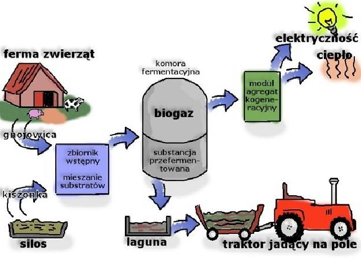 ENERGIA Z ODPADÓW ORGANICZNYCH W Polsce około 10 gospodarstw rolnych wykorzystuje energię biogazu z odchodów zwierzęcych do produkcji ciepła. W procesach fermentacji odpadów biologicznych wytwarza się gaz, który ma szerokie zastosowanie w gospodarstwach i przedsiębiorstwach rolniczych. Firmy kompostujące gromadzą i przetwarzają odpady biologiczne dostarczane z rzeźni, ubojni, gospodarstw ogrodniczo-rolniczych a także z innych przedsiębiorstw przemysłowych. Zamiast bezproduktywnie spalać biogaz powstający w procesie kompostowania odpadów, można go wykorzystać jako paliwo dla silników gazowych stosowanych w układach wytwarzania energii elektrycznej.