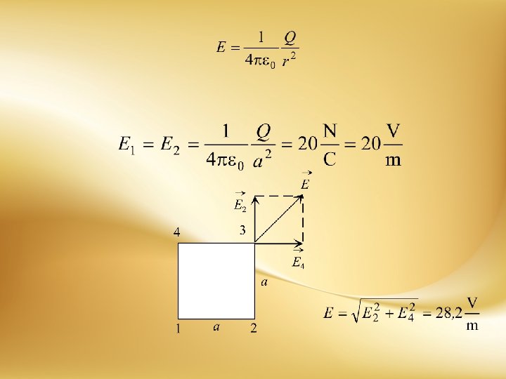 Dva tačkasta naelektrisanja nalaze se u vazduhu u temenima kvadrata stranice , i to, u temenu 2, a u temenu 4. Odrediti intenzitet, pravac i smer delovanja jačine električnog polja u temenu 3.
