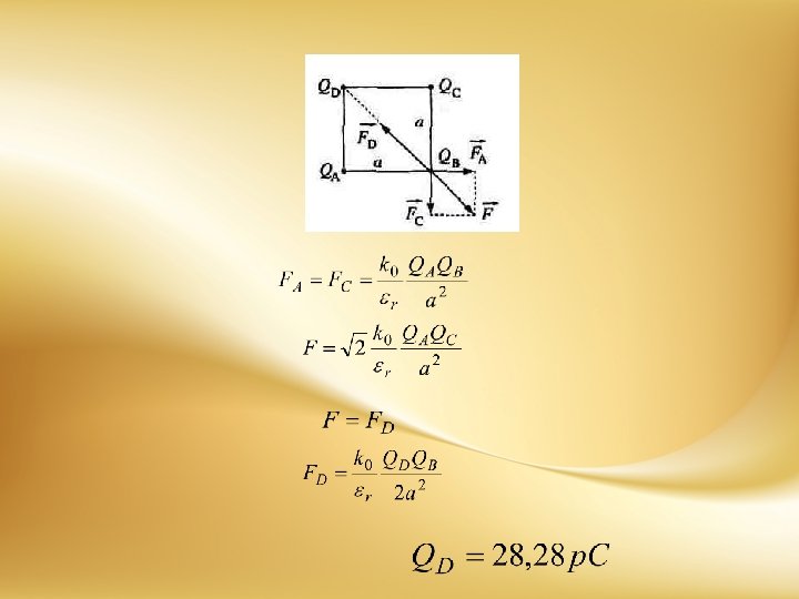 U temenima A, B i C kvadrata stranice a = 30 cm nalaze se tačkasta naelektrisanja (slika). Odrediti, po znaku i vrednosti, naelektrisanje , koje treba postaviti u temenu D, da bi sila na naelektrisanje bila jednaka nuli. Sistem se nalazi u vakuumu.