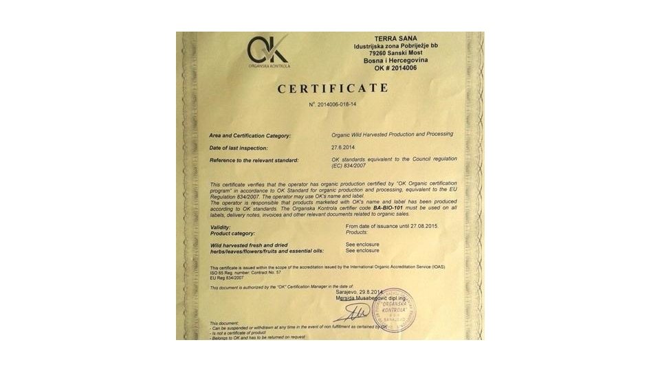 • "Organska kontrola" prva je certifikacijska organizacija od 2007. godine dodjeljuje certifikate domaćim proizvođačima organske hrane. • Proizvodnja i prerada ljekovitog bilja, jagodastog i koštičavog voća, povrća na otvorenom i u plastenicima, te neki specifični proizvodi kao što su med, samoniklo ljekovito bilje, šumski plodovi i gljive imaju perspektivu u Bi. H i realnu mogućnost plasmana u EU i na svjetskom tržištu. • OK je dizajnirala i Bi. H markicu za organske proizvode (OK logo). • Program je akreditiran od strane IFOAM-a i ISO 65. IFOAM akreditirana tijela imaju pravo uz svoju organsku markicu koristiti IFOAM oznaku, koja potrošačima širom svijeta predstavlja garanciju da je certifikacijski program nadziran od strane međunarodno priznatog akreditacijskog tijela.