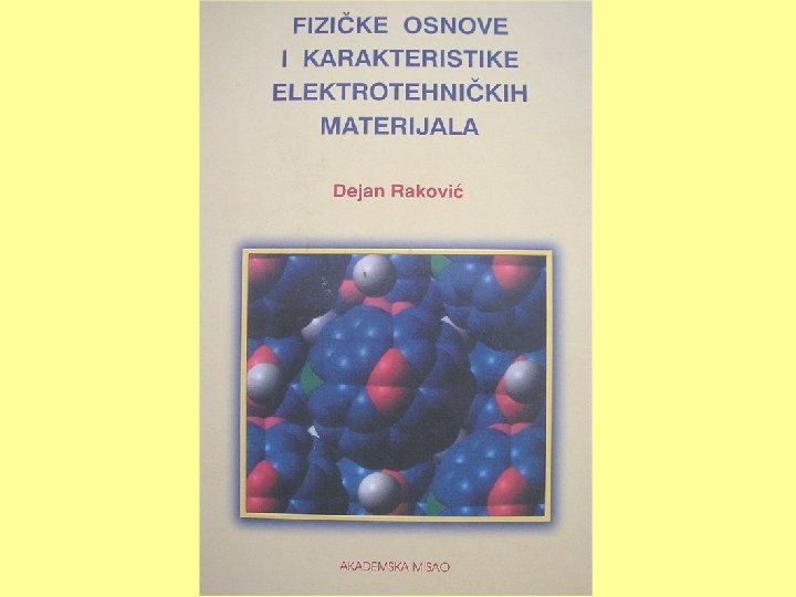 LITERATURA 1. D. Raković, Fizičke osnove i karakteristike elektrotehničkih materijala (Akademska misao, Beograd, 2000). 2. D. Raković, Lj. Turković, S. Krstić, Savremeni materijali i tehnologije (Grosknjiga, Beograd, 1997). 3. D. Raković, P. Osmokrović, N. Arsić, Elektrotehnički materijali. Zbirka zadataka (Akademska misao, Beograd, 2003). 4. D. Raković, P. Osmokrović, D. Veljković, N. Cvetković, S. Josipović, N. Kartalović, Priručnik za laboratorijske vežbe iz elektrotehničkih materijala i fizike materijala (ETF, Beograd, 2004). 5. CD sa Ppt-prezentacijama i dopunskom literaturom. NASTAVA & ISPIT 1. Predavanja (45), računske vežbe (20) i laboratorijske vežbe (10). 2. Ispit iz 2 dela (Kolokvijum i Ispit: po 2 zadatka, 1 pitanje, 25 test pitanja).