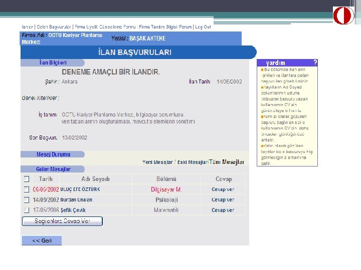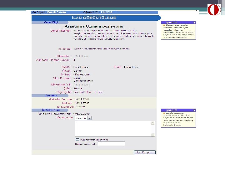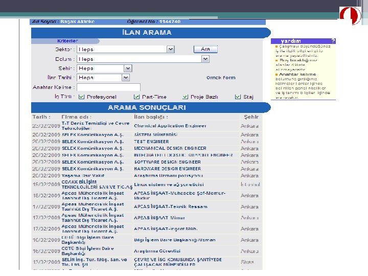 KPM Web Sitesi - Öğrenci/Mezun vÜyelik Bilgilerini Güncelleme v. CV hazırlama: § Genel Bilgiler, Eğitim Bilgileri, Kariyer Bilgileri, İş Bilgileri, Gizlilik, CV Görüntüleme v. Klasik CV yükleme vİlan Arama § Kriterler: Sektör, Bölüm, Şehir, İlan Tarihi, İş Türü: Profesyonel, Part-time, Proje-bazlı, Staj vİlana Başvurma