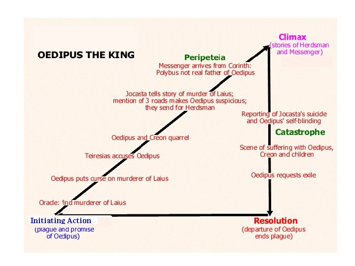 The Catastrophe • • • Jocasta commits suicide Oedipus’ blinds himself Lives a moment to fear and remorse with his children He requests to be exiled. The plague is removed