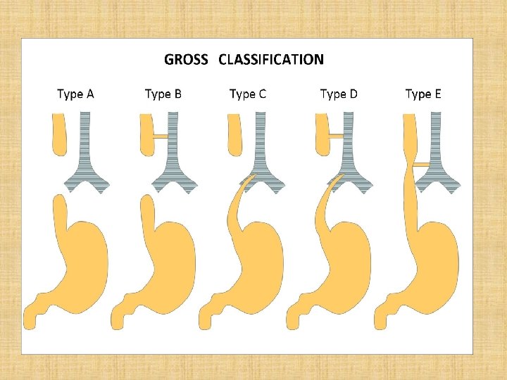 ESOPHAGEAL ATRESIA & TRACHEOESOPHAGEAL FISTULA • Prevalence 1 in 3000 live births, M=F. • Infants with these conditions are often premature, and polyhydramnios is commonly diagnosed prenatally. • Classification & Incidence: • • • Atresia with distal TEF 85. 4% Atresia without TEF 7. 3% TEF without atresia 2. 8% Atresia with proximal & distal TEF 2. 1% Atresia with proximal TEF < 1. 0%