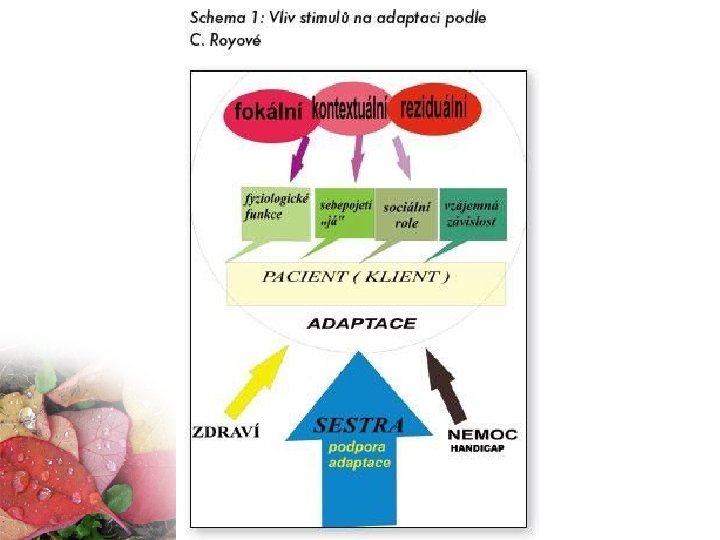 Elementy modelu • Zájem sestry o pacienta • Ošetřování jako podpora a napomáhání pacientovy adaptace • Podpora procesu adaptace • Soustřeďování se na pacienta na jedince adaptujícího se na stimuly