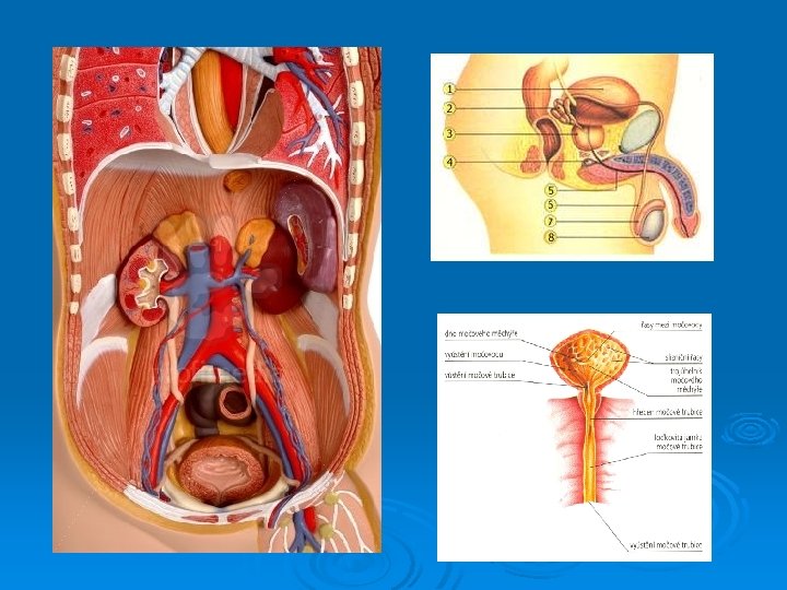 Patologické názvosloví Ø Ø Ø Ø Ø polyurie – nad 3000 ml/ hod oligurie – pod 500 ml/ 24 hod anurie – pod 100 ml/ 24 hod dysurie – obtížné močení, bolest strangurie – pálení, řezání při močení polakisurie – časté močení, ne změna množství nykturie – močení v noci enuresis – pomočování už moč udrželi enuresis nocturna – noční pomočování retence – zadržení v mm