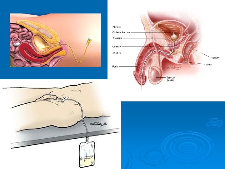 Katetrizace močového měchýře Ø déle než 30 dnů v 5 - 10 % přítomná bakteriurie Ø rizikový faktor pro vznik nozokomiální infekce Důvod katetrizace Ø retence moče - reziduální moč při retenci Ø příprava před vyšetřením, operací Ø diagnostika – odběr sterilního vzorku moči Ø zavedení permanentního močového katétru Ø výplach močového měchýře