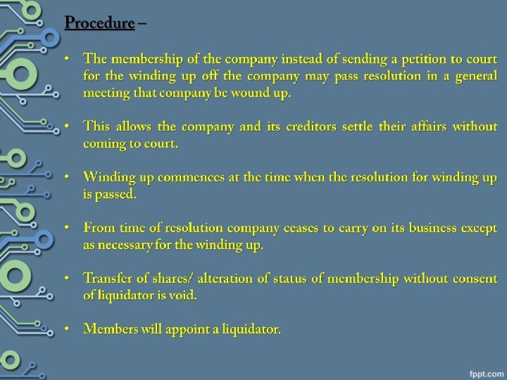 2. Voluntary Winding Up Members of company can resolve to wind up a company if; 1. Company has been formed for a particular period / until a particular event occurs & that period had lapsed / the event has occurred & in a general meeting members by ordinary resolution decide to wind up. 1. Members resolve to wind up by Special Resolution. • Members decide that company cannot continue business