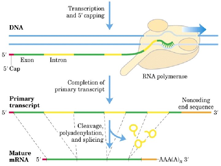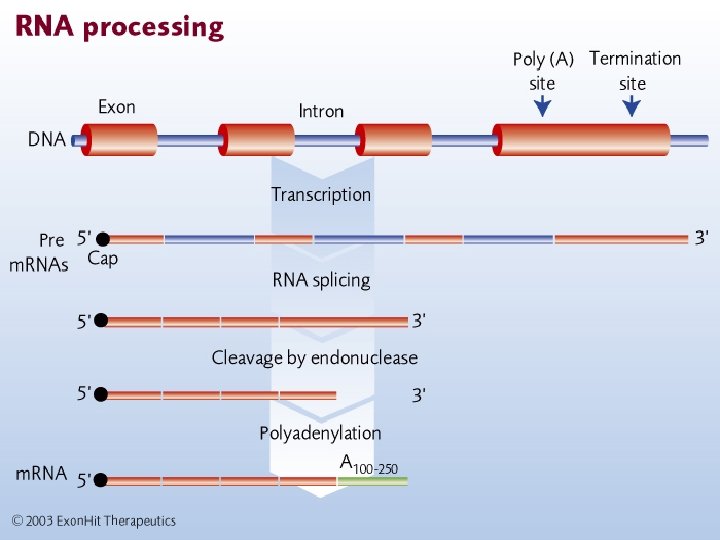Other processing steps v 5’ cap: 7 -methylguanosine (7 m. G) attached to 5’ end of the transcript, usually during elongation v 3’ poly-A tail: ~200 adenine added to the 3’ end of the transcript Attachment of the poly-A tail is directed by a consensus sequence toward the 3’ end of the transcript