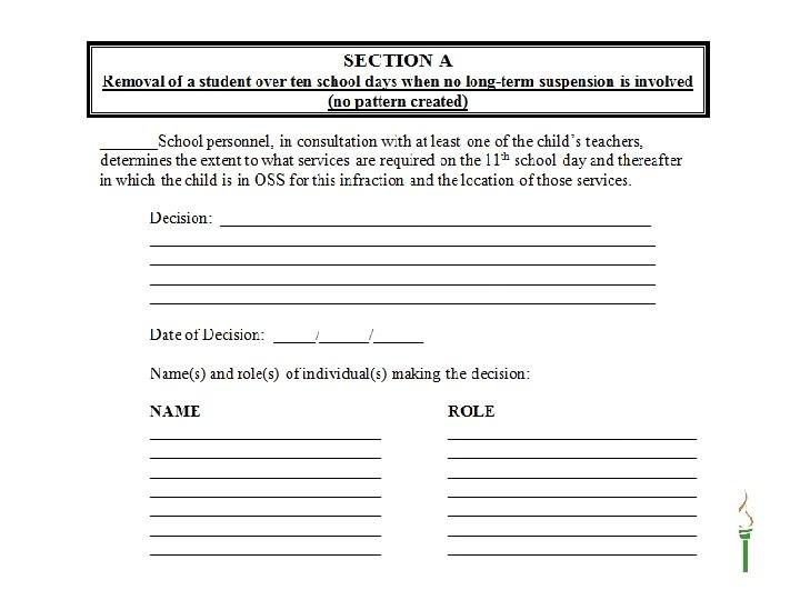 Suspension that results in more than 10 cumulative days (OSS), but no change of placement Total number of OSS days for THIS infraction = __5__ Total number of OSS days this school year = __12__ More than 10 cumulative days? YES Total number of days for THIS infraction greater than 10 days? Enter the number of OSS days this school year prior to this infraction = __7__ Has a pattern been created? NO NO Refer to Section A of the State Discipline Documentation form
