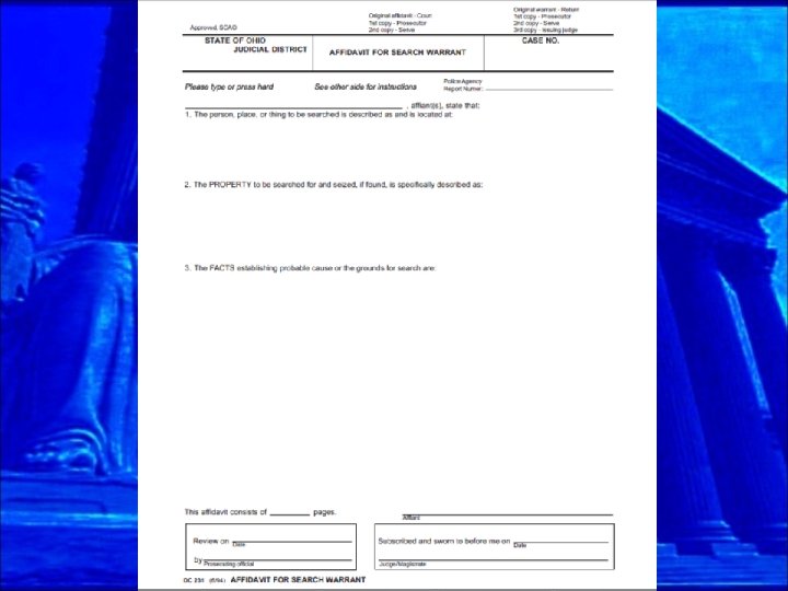 OHIO STATE CONSTITUTION ¨ The right of the people to be secure in their persons, houses, papers, and possessions, against unreasonable searches and seizures shall not be violated; and no warrant shall issue, but upon probable cause, supported by oath or affirmation, particularly describing the place to be searched and the person and things to be seized. ¨ This language is almost verbatim to the language of the Fourth Amendment to the U. S. Constitution.